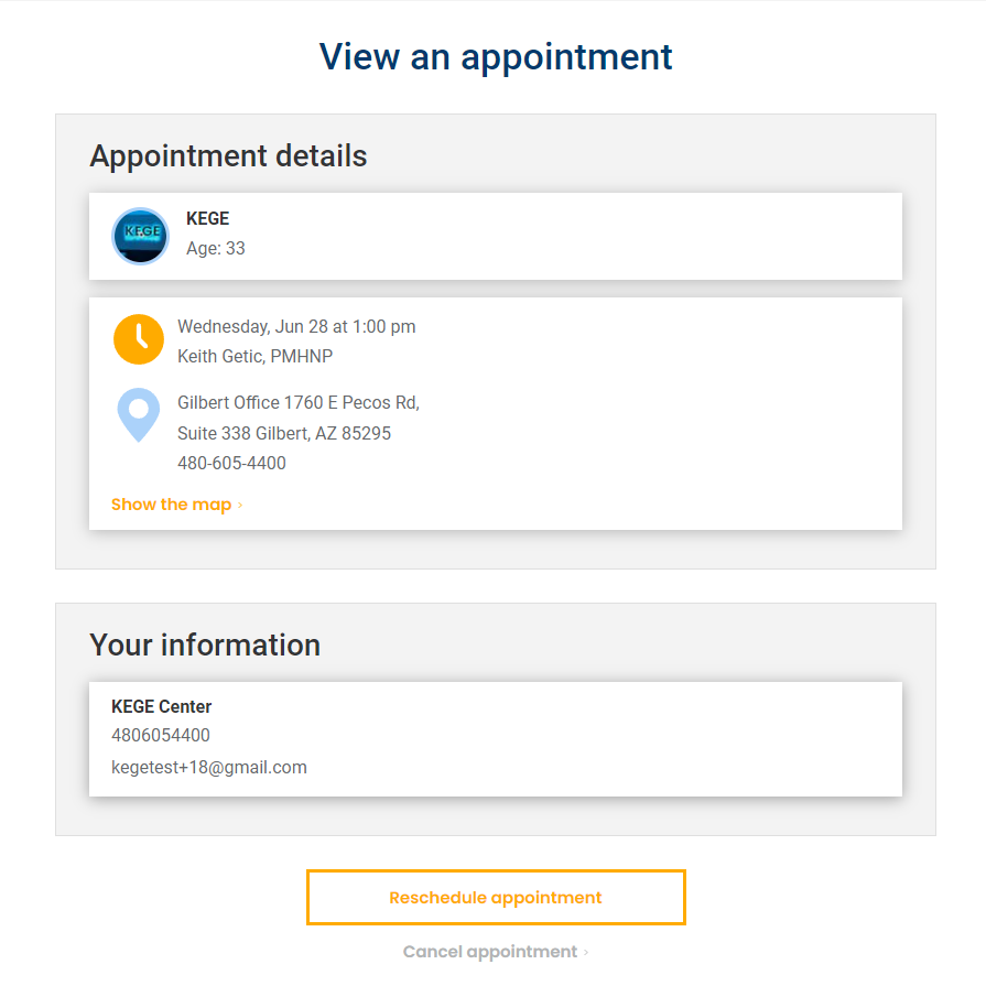 KEGE Patient portal allows you to view all current and past appointments. You can also make changes to appointments up to 24 hours prior to the scheduled start time. There are a few different ways you can view or make changes to scheduled appointments by following this process: